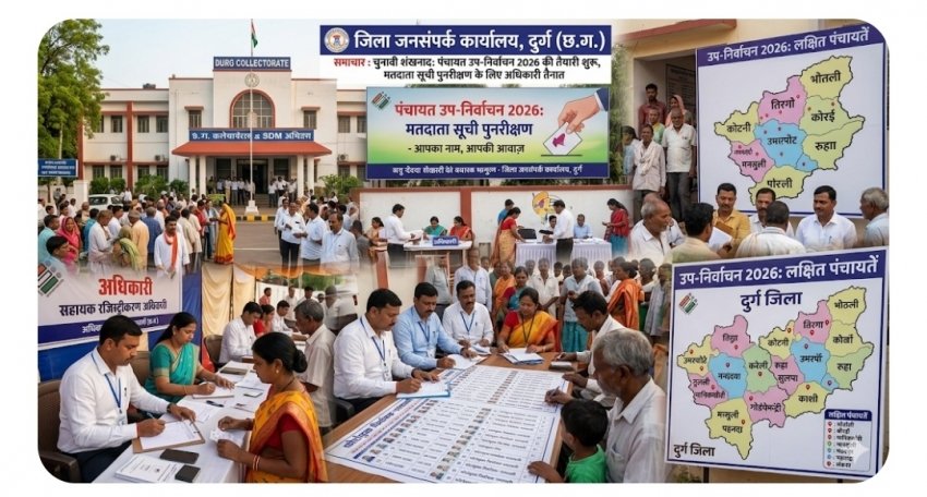 दुर्ग, । जिले में त्रिस्तरीय पंचायत उप-निर्वाचन 2026 की प्रक्रिया गति पकड़ चुकी है। कलेक्टर एवं जिला निर्वाचन अधिकारी (पंचायत) के निर्देशानुसार, जिले की तीन प्रमुख जनपद पंचायतों—दुर्ग, धमधा और पाटन—में फोटोयुक्त निर्वाचक नामावली (मतदाता सूची) तैयार करने का कार्य युद्ध स्तर पर प्रारंभ कर दिया गया है।